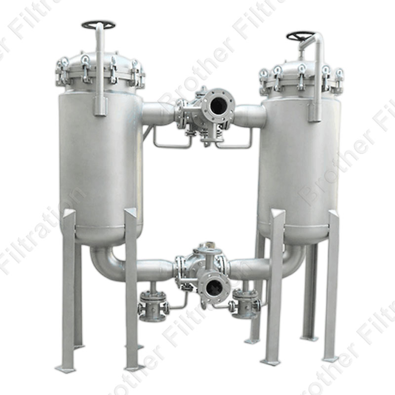 Two single-bag filters are joined by valves to form a duplex bag filter. Typically, one bag filter is used for filtering while the other serves as a backup during the process. The inlet is located higher than the filter bags.